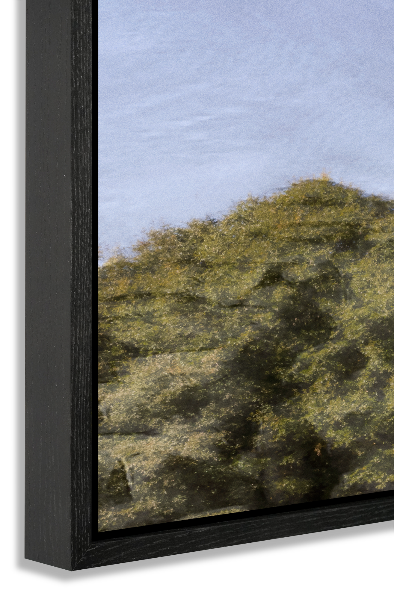 This artwork is printed on premium museum-quality giclee canvas and is presented in a solid oak float frame that is finished with hand rubbed dark bronze finish that is 2 1/2 inches deep. It is also available unframed.