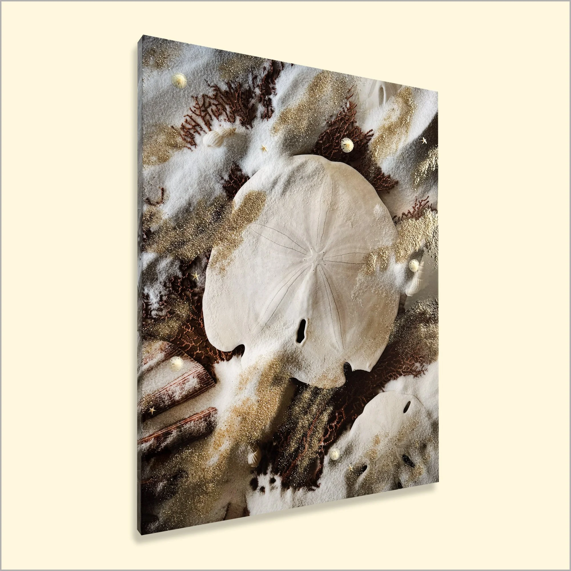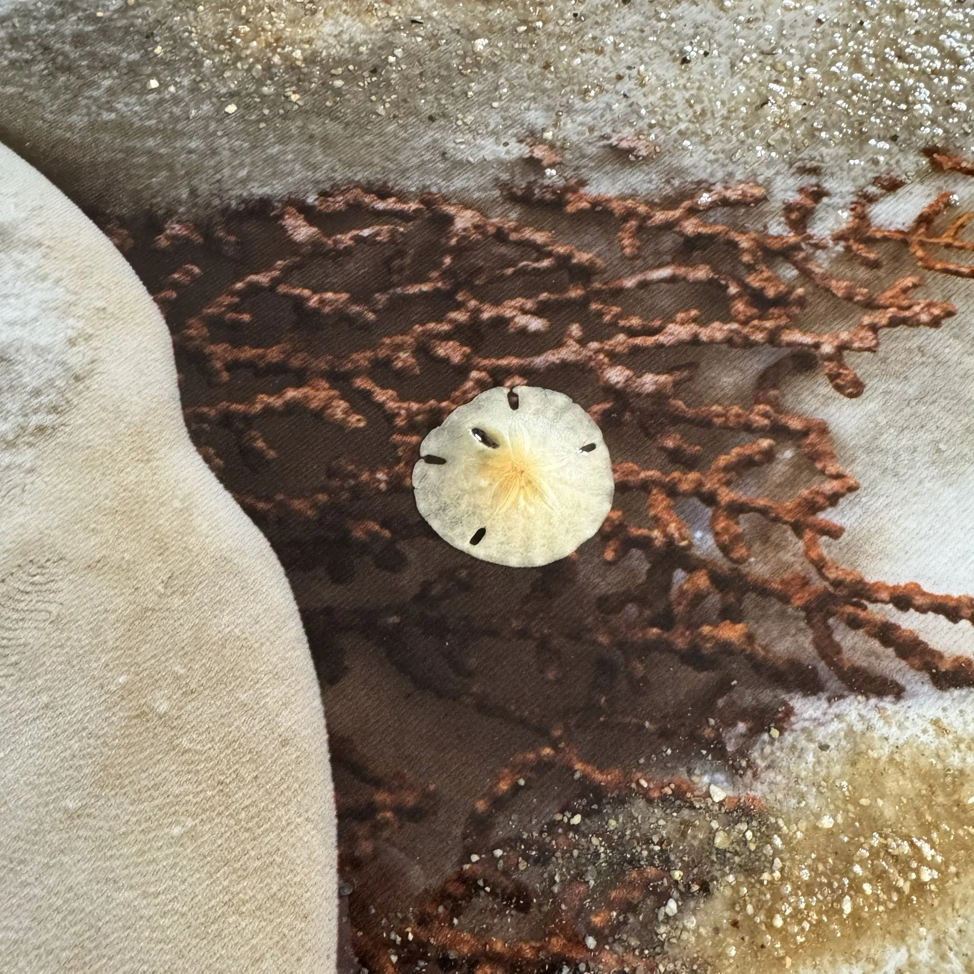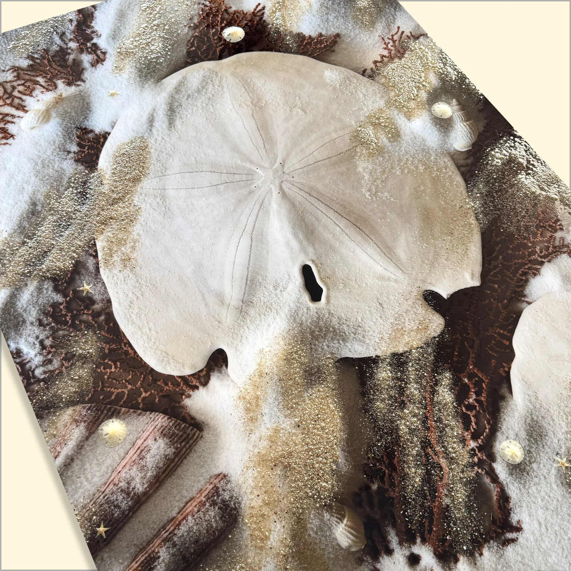 Close-up detail - Embedded beach sand and sand dollar(s) are added.